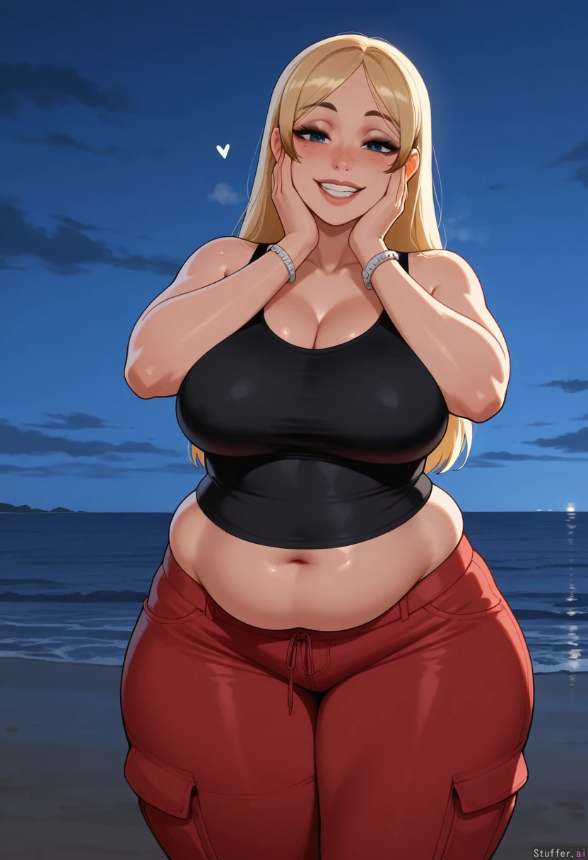 nyantcha:1.2), (krekkov:1.4), (reiq:1.1), (kittew:1.3), best quality, intricate details, hdr, detailed eyes, (soft shading), realistic, dim lighting, realistic lighting, 1woman, ((Yuki Tsukumo from Jujutsu Kaisen)), ((chubby goth mommy)), short-ish hair down middle-part straight_hair, standing, teasing (caressing cheeks with own hands), looking at viewer (front view), flirty, blonde hair with blonde highlighted tips, dark blue eyes, black eyeshadow and eyeliner, lots of freckles, her bangs are blonde, wide hips, ((thick thighs:1.4)), large breasts, (chubby belly:2.0), tummy pooch, legs crossed, happy, sweet, nave, flushed, ((obese:1.3)), chubby figure, fatass, large protruding belly, Black tank top, no bra, baggy red cargo pants, white bracelets, Beach at evening,