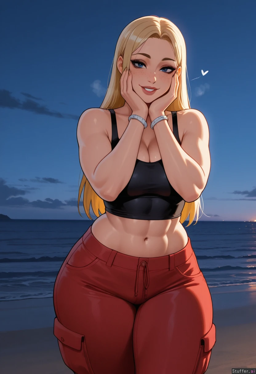 nyantcha:1.2), (krekkov:1.4), (reiq:1.1), (kittew:1.3), best quality, intricate details, hdr, detailed eyes, (soft shading), realistic, dim lighting, realistic lighting, 1woman, ((Yuki Tsukumo from Jujutsu Kaisen)), ((goth mommy)), short-ish hair down middle-part straight_hair, standing, teasing (caressing cheeks with own hands), looking at viewer (front view), flirty, blonde hair with blonde highlighted tips, dark blue eyes, black eyeshadow and eyeliner, lots of freckles, her bangs are blonde, wide hips, ((thick thighs:1.4)), medium breasts, (abs:2.0), tummy pooch, legs crossed, happy, sweet, nave, flushed, ((fit:1.3)), sexy figure, fatass, Black tank top, no bra, baggy red cargo pants, white bracelets, Beach at evening,