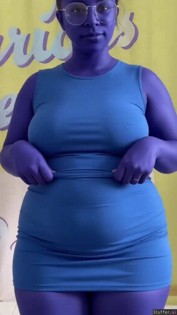Change her clothes into a very tight short blue dress, make her gain a lot of weight, all of her skin is now indigo