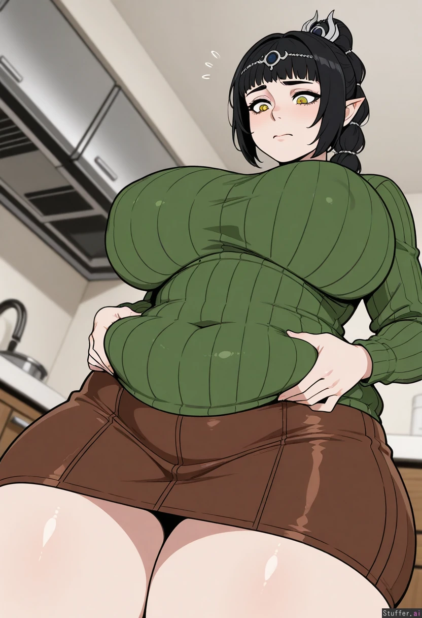 ((flat colors)), ((Shadowheart from Baldur's Gate III)), (Covered navel, long brown leather skirt, ribbed long sleeve green sweater), tight clothes, Long blone ponytail, black bangs, pale skin, short, Kitchen, standing, worried, concerned, weight conscious, (From below, low angle), (Chubby), Huge breasts, plump breasts, wide spread breasts, huge hips, wide hips, hips_wider_than_shoulders, huge ass, huge butt, huge thighs, thicc thighs