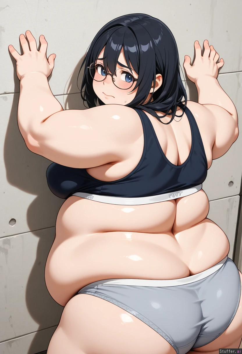 gender: (female) face: (round glasses, european, wide eye gap) hair: (black hair, straight) body: (thin body type, medium sized perky breasts, small waist, wide hips, soft belly, ass back, chest forward, body leaning forward, her hands on the wall bracing, (overweight:2) clothes: (underwear) action: (fucked from behind, belly is getting grabbed) Face: (ashamed, shy, embarrassed, self conscious)