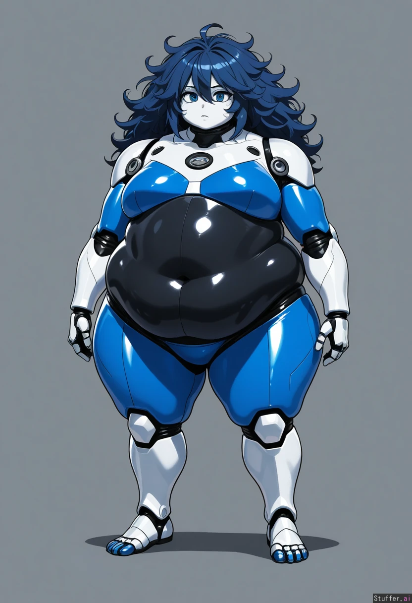 Robot, chrome skin, black and blue eyes, black and blue very long and messy hair, fat, bottom heavy