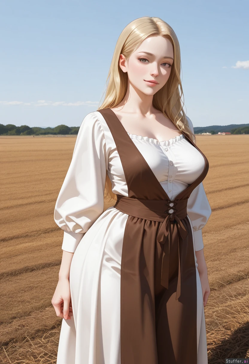 (High definition, vivid details, realistic, natural light) (Square jaw, cute face, European peasant woman, pale skin, blonde hair, wearing white gown, brown apron) ((Standing in farm field)) ((Stocky body)), (curvaceous) ((Perky breasts:1.0)) ((Wide hips:1.0))