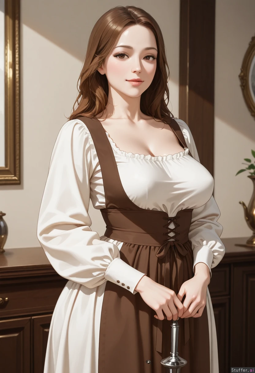 (High definition, vivid details, realistic, natural light) (Square jaw, cute face, European peasant woman, pale skin, short brown hair, wearing white gown, brown apron) ((Churning butter)) ((Stocky body)), (curvaceous) ((Perky breasts:1.0)) ((Wide hips:1.0))