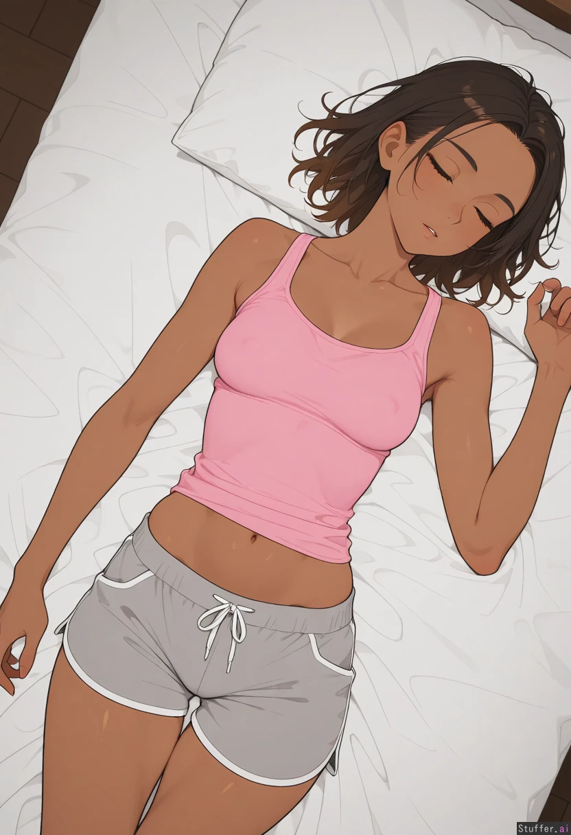 (High definition, vivid details, natural light, from above), ((simple shading, flat color)) (Brown skin, Indian woman, wearing pink tank top, grey pajama shorts) ((Asleep, laying down in bed)) ((Skinny)), fit, athletic ((Small tits)) ((Wide hips:1.0))