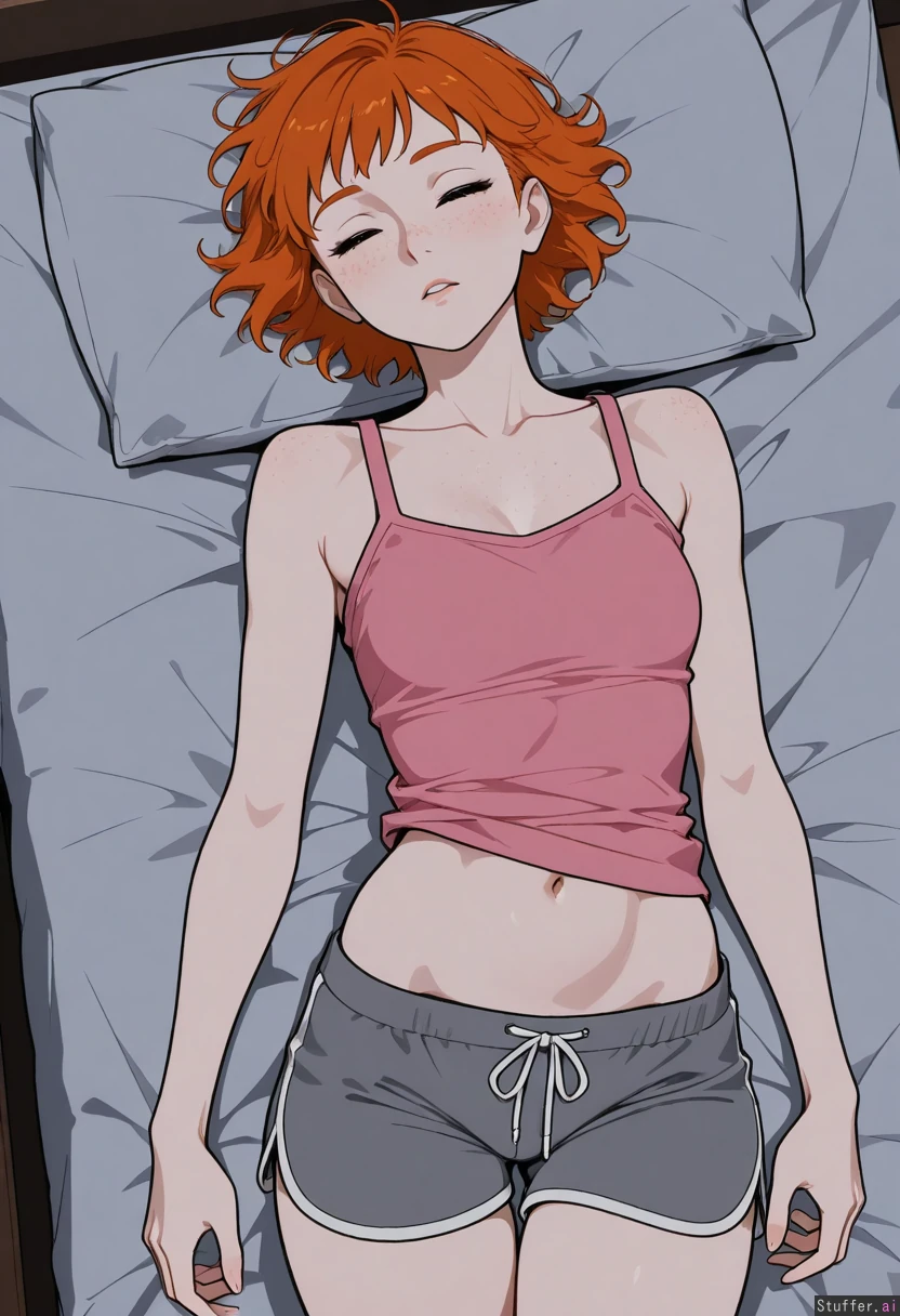 (High definition, vivid details, night light, from above), ((simple shading, flat color)) (Ginger hair, short hair, pale skin, lots of freckles, 25 years old, wearing pink tank top, grey pajama shorts) ((Asleep, laying down in bed)) ((Skinny)), fit, athletic ((Small tits)) ((Wide hips:1.0))