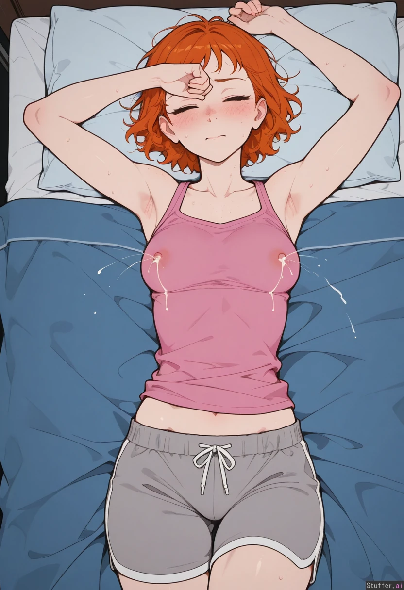 (High definition, vivid details, night light, from above), ((simple shading, flat color)) (Ginger hair, short hair, pale skin, lots of freckles, 25 years old, wearing pink tank top, grey pajama shorts) ((Asleep, eyes closed, laying down in bed, blushing, sweating)) ((Skinny)), fit, athletic ((Small tits)), nipple outlines, ((lactating)) ((Wide hips:1.0))