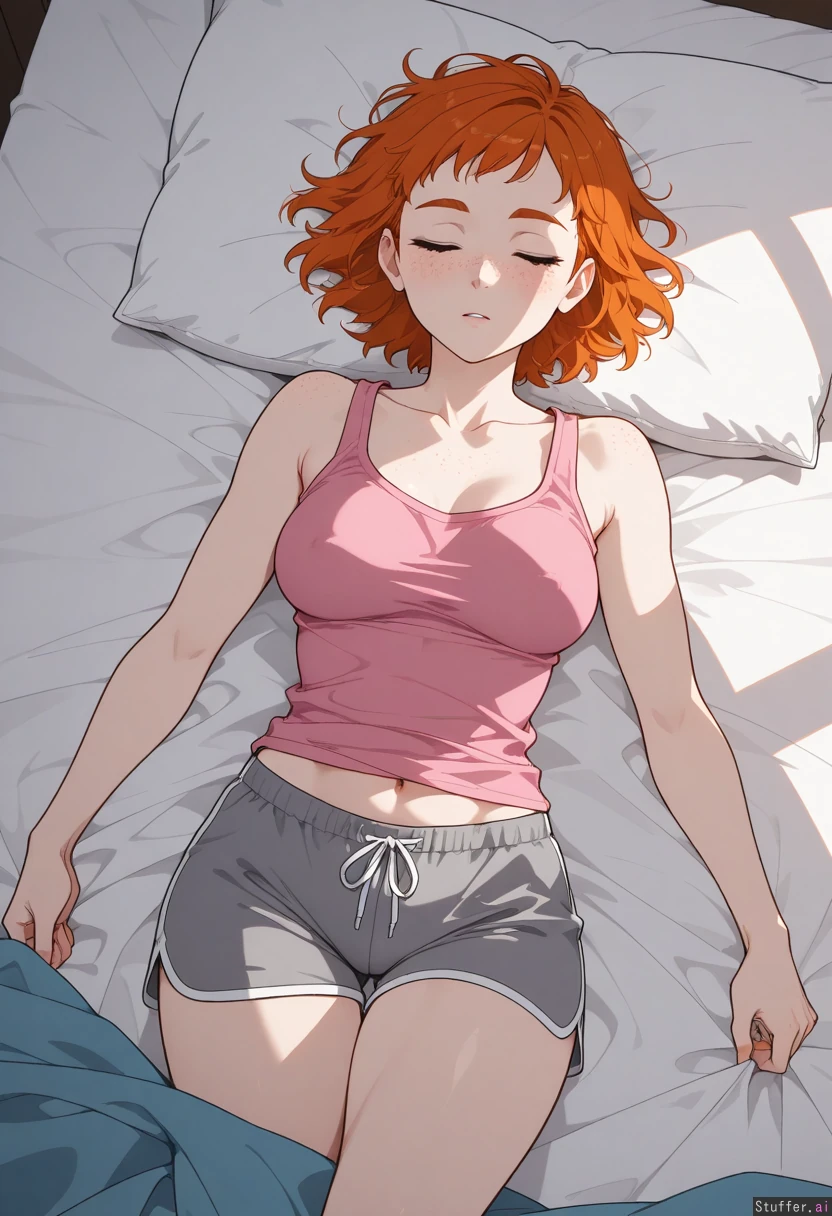 (High definition, vivid details, morning light, from above), ((simple shading, flat color)) (Ginger hair, short hair, pale skin, lots of freckles, 25 years old, pink tank top, grey pajama shorts) ((Laying in bed, asleep, eyes closed)) ((Skinny)), fit, athletic ((Small tits)), nipple outlines ((Wide hips:1.0))