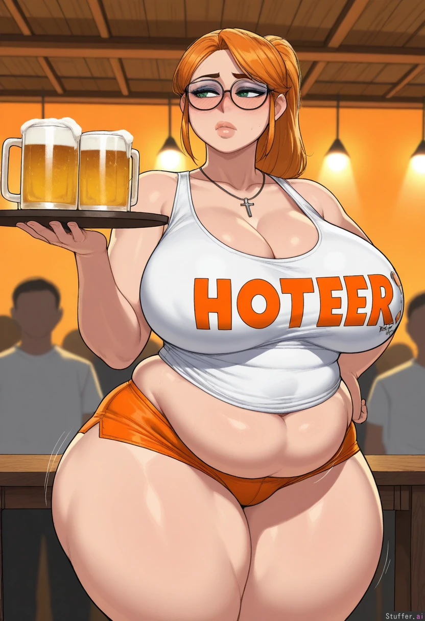 (( solo, krekkov, adult)) (( female, blue_eyeshadow, green_eyes, thick_lips, ((detailed_eyes)) )), ginger hair, long ponytail, glasses ((Hooters, white_shirt, orange_shorts, cleavage, cross_necklace)) (( Wide_hips)) (( Thick_thighs:1.5)) (( huge_breast:1.1)) (( fat_belly:1.5)) (( Crowd, dramatic_lighting,((orange_lighting)), Standing, fancy_restaurant, ((side_view)), wood_table, half-closed_eyes, beer_mugs, looking_away, heavy_blush, holding_tray, motion_lines hand_on_hips)), shy