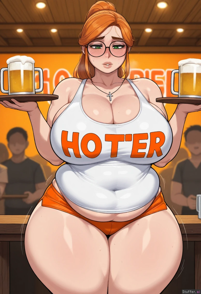 (( solo, krekkov, adult)) (( female, green_eyes, thick_lips, ((detailed_eyes)) )), ginger hair, long ponytail, glasses ((Hooters, white_shirt, orange_shorts, cleavage, cross_necklace)) (( Wide_hips)) (( Thick_thighs:1.5)) (( huge_breast:1.1)) (( fat_belly:1.5)) (( Crowd, dramatic_lighting,((orange_lighting)), Standing, fancy_restaurant, ((side_view)), wood_table, beer_mugs, looking_down, heavy_blush, holding_tray, motion_lines hand_on_hips)), shy, fresh freckles, heavy_breathing