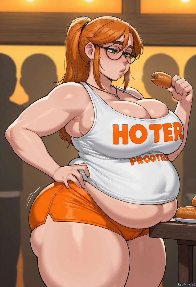 (( solo, krekkov, adult)) (( female, green_eyes, thick_lips, ((detailed_eyes)) )), ginger hair, long ponytail, glasses ((Hooters, white_shirt, orange_shorts, cleavage, cross_necklace)) (( Wide_hips)) (( Thick_thighs:1.4)) (( medium_breast:1.1)) (( fat_belly:1.5)) Fat legs Fat arms (( Crowd, dramatic_lighting,((orange_lighting)), Standing, fancy_restaurant, ((side_view)), wood_table, eating food, looking_down, heavy_blush, holding_food, motion_lines hand_on_hips)), shy, fresh freckles, heavy_breathing, nipple_bulge,
