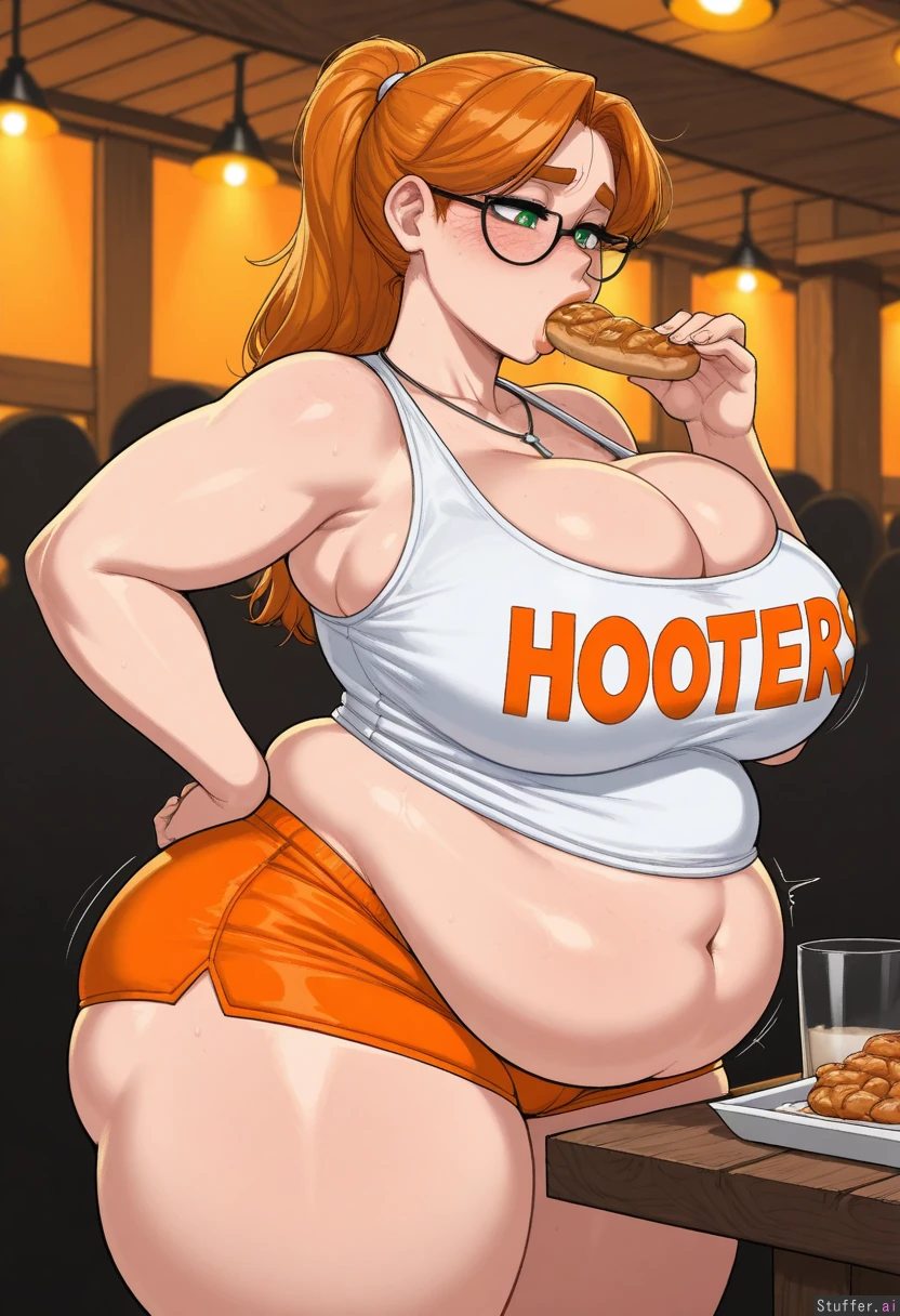 (( solo, krekkov, adult)) (( female, green_eyes, thick_lips, ((detailed_eyes)) )), ginger hair, long ponytail, glasses ((Hooters, white_shirt, orange_shorts, cleavage, cross_necklace)) (( Wide_hips)) (( Thick_thighs:1.4)) (( medium_breast:1.1)) (( fat_belly:1.5)) Fat legs, obese arms (( Crowd, dramatic_lighting,((orange_lighting)), Standing, fancy_restaurant, ((side_view)), wood_table, eating food, looking_down, heavy_blush, holding_food, motion_lines hand_on_hips)), shy, fresh freckles, heavy_breathing, nipple_bulge,