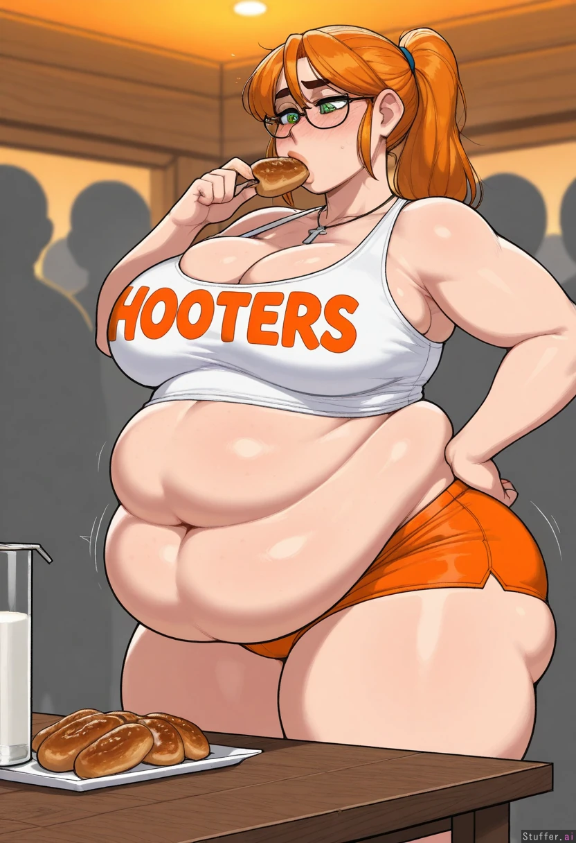 (( solo, krekkov, adult)) (( female, green_eyes, thick_lips, ((detailed_eyes)) )), ginger hair, long ponytail, glasses ((Hooters, white_shirt, orange_shorts, cleavage, cross_necklace)) (( Wide_hips)) (( Thick_thighs:1.4)) (( medium_breast:1.1)) (( fat_belly:1.8)) Fat legs, obese arms (( Crowd, dramatic_lighting,((orange_lighting)), Standing, fancy_restaurant, ((side_view)), wood_table, eating food, looking_down, heavy_blush, holding_food, motion_lines hand_on_hips)), shy, fresh freckles, heavy_breathing, nipple_bulge, sagging_belly, chubby face, stretch_marks:1.4, deep_navel, obese neck, obese