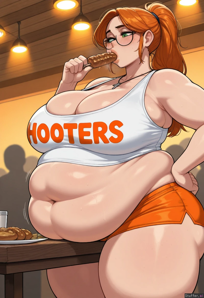 (( solo, krekkov, adult)) (( female, green_eyes, thick_lips, ((detailed_eyes)) )), ginger hair, long ponytail, glasses ((Hooters, white_shirt, orange_shorts, cleavage, cross_necklace)) (( Wide_hips)) (( Thick_thighs:1.4)) (( medium_breast:1.1)) (( fat_belly:1.8)) Fat legs, obese arms (( Crowd, dramatic_lighting,((orange_lighting)), Standing, fancy_restaurant, ((side_view)), wood_table, eating food, looking_down, heavy_blush, holding_food, motion_lines hand_on_hips)), shy, fresh freckles, heavy_breathing, nipple_bulge, sagging_belly, chubby face, stretch_marks:1.4, deep_navel, obese neck, morbidly_obese_female:1.6