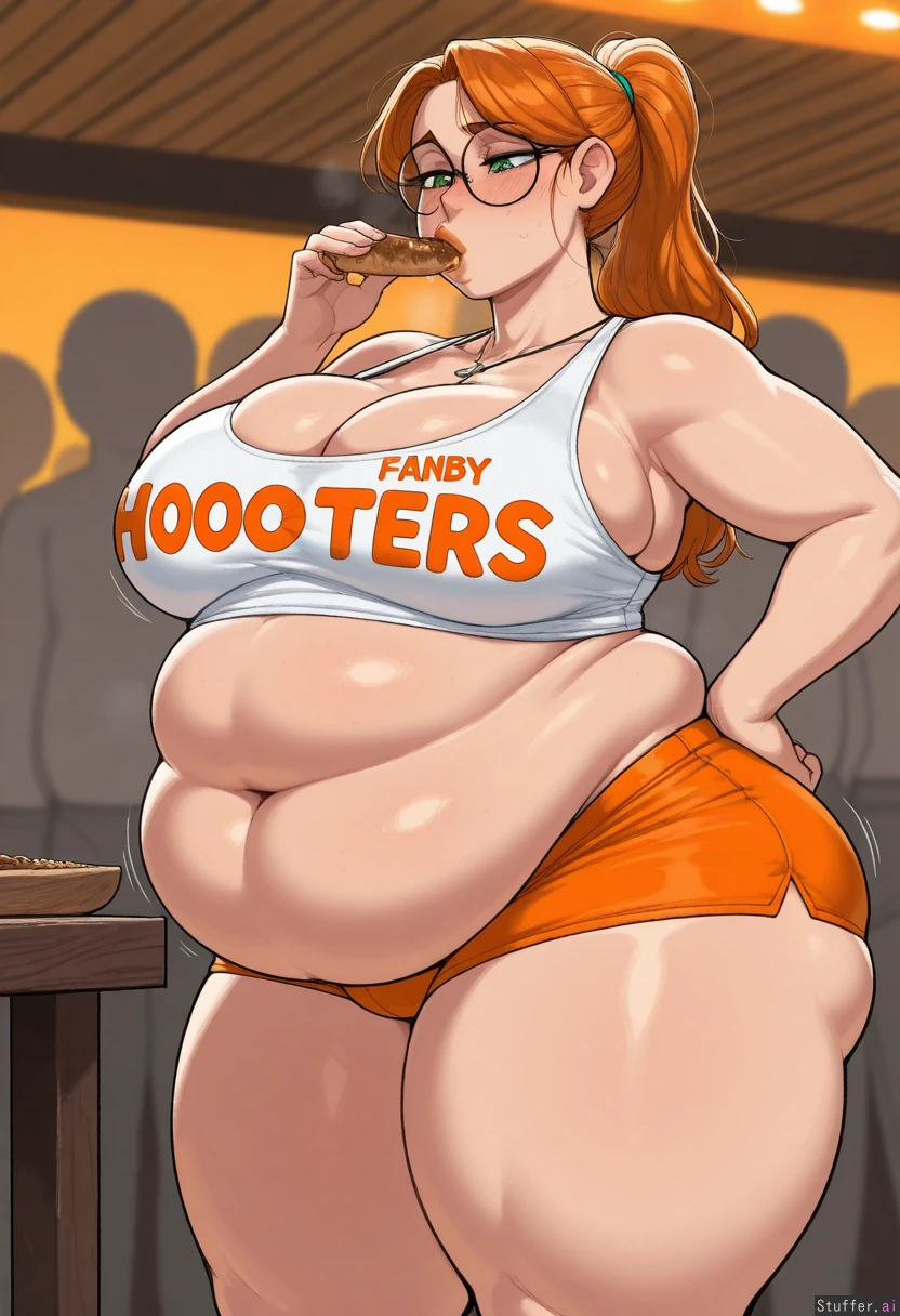 (( solo, krekkov, adult)) (( female, green_eyes, thick_lips, ((detailed_eyes)) )), ginger hair, long ponytail, glasses ((Hooters, white_shirt, orange_shorts, cleavage, cross_necklace)) (( Wide_hips)) (( Thick_thighs:1.4)) (( medium_breast:1.1)) (( fat_belly:1.8)) Fat legs, obese arms (( Crowd, dramatic_lighting,((orange_lighting)), Standing, fancy_restaurant, ((side_view)), wood_table, eating food, looking_down, heavy_blush, holding_food, motion_lines hand_on_hips)), shy, fresh freckles, heavy_breathing, nipple_bulge, sagging_belly, chubby face, stretch_marks:1.4, deep_navel, obese neck, morbidly_obese_female:1.6