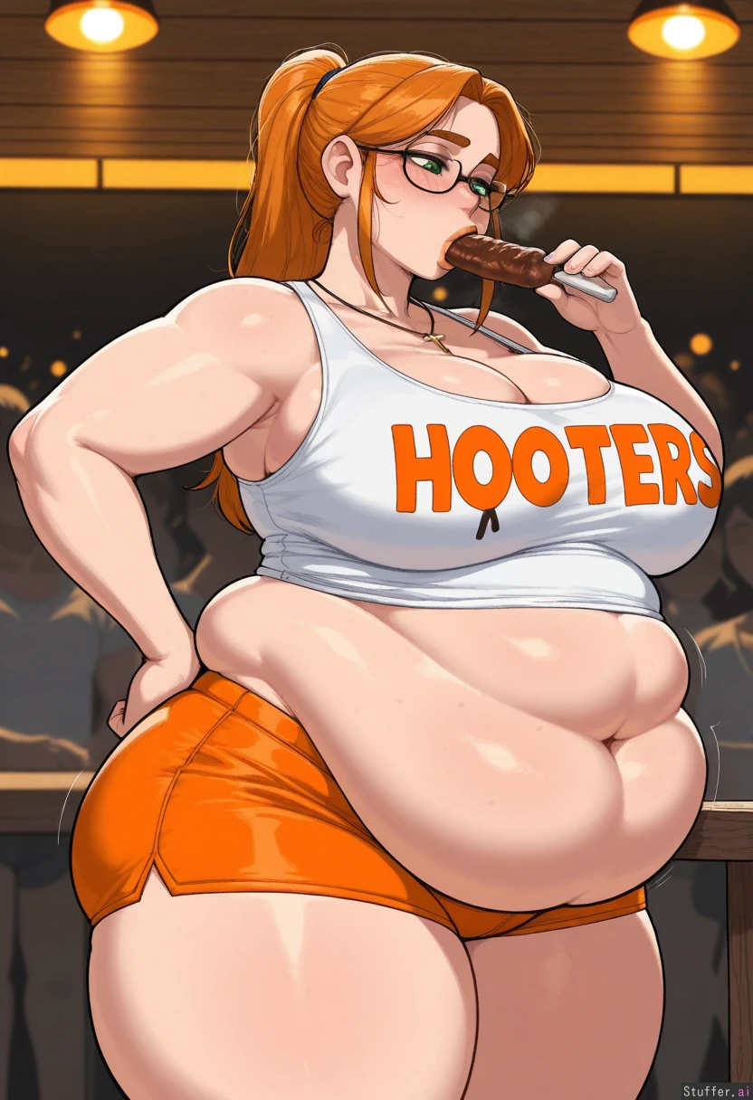 (( solo, krekkov, adult)) (( female, green_eyes, thick_lips, ((detailed_eyes)) )), ginger hair, long ponytail, glasses ((Hooters, white_shirt, orange_shorts, cleavage, cross_necklace)) (( Wide_hips)) (( Thick_thighs:1.4)) (( medium_breast:1.1)) (( fat_belly:1.8)) Fat legs, obese arms (( Crowd, dramatic_lighting,((orange_lighting)), Standing, fancy_restaurant, ((side_view)), wood_table, eating food, looking_down, heavy_blush, holding_food, motion_lines hand_on_hips)), shy, fresh freckles, heavy_breathing, nipple_bulge, sagging_belly, chubby face, stretch_marks:1.4, deep_navel, obese neck, ssbbw:1.6