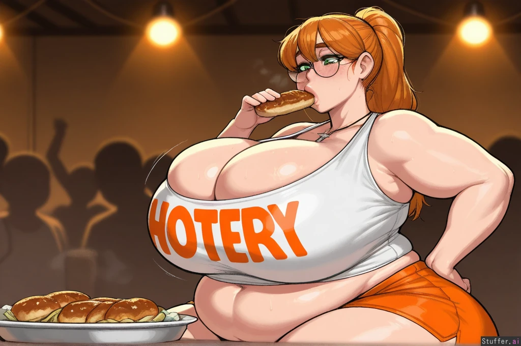 (( solo, krekkov, adult)) (( female, green_eyes, thick_lips, ((detailed_eyes)) )), ginger hair, long ponytail, glasses ((Hooters, white_shirt, orange_shorts, cleavage, cross_necklace)), immobile:1.6 Hyper belly. Gigantic thighs, gigantic butt, gigantic breasts Fat legs, obese arms (( Crowd, dramatic_lighting,((orange_lighting)), sitting, fancy_restaurant, ((side_view)), wood_table, eating food, looking_down, heavy_blush, holding_food, motion_lines hand_on_hips)), shy, fresh freckles, heavy_breathing, nipple_bulge, sagging_belly, chubby face, stretch_marks:1.4