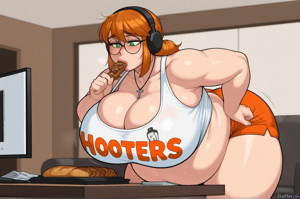 (( solo, krekkov, adult)) (( female, green_eyes, thick_lips, ((detailed_eyes)) )), ginger hair, long ponytail, glasses ((Hooters, white_shirt, orange_shorts, cleavage, cross_necklace)), immobile, too fat to stand, stuffed gigantic_belly, gigantic_breasts, gigantic_thighs, hyper_belly, hyper_breasts, hyper_thighs, mature, bloated_belly, immobile, morbidly_obese, indoors, computer, headphones, messy_room, eating, takeout_containers, couch, casual, eating food, looking_down, heavy_blush, holding_food, motion_lines hand_on_hips)), shy, fresh freckles, heavy_breathing, nipple_bulge, sagging_belly, chubby face