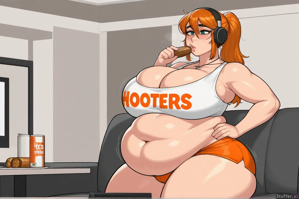 (( solo, krekkov, adult)) (( female, green_eyes, thick_lips, ((detailed_eyes)) )), ginger hair, long ponytail, glasses ((Hooters, white_shirt, orange_shorts, cleavage, cross_necklace)), immobile, too fat to stand, stuffed gigantic_belly, gigantic_breasts, gigantic_thighs, hyper_belly, hyper_breasts, hyper_thighs, mature, bloated_belly, immobile, morbidly_obese, indoors, computer, headphones, messy_room, eating, takeout_containers, couch, casual, eating food, looking_down, heavy_blush, holding_food, motion_lines hand_on_hips)), shy, fresh freckles, heavy_breathing, nipple_bulge, sagging_belly, chubby face