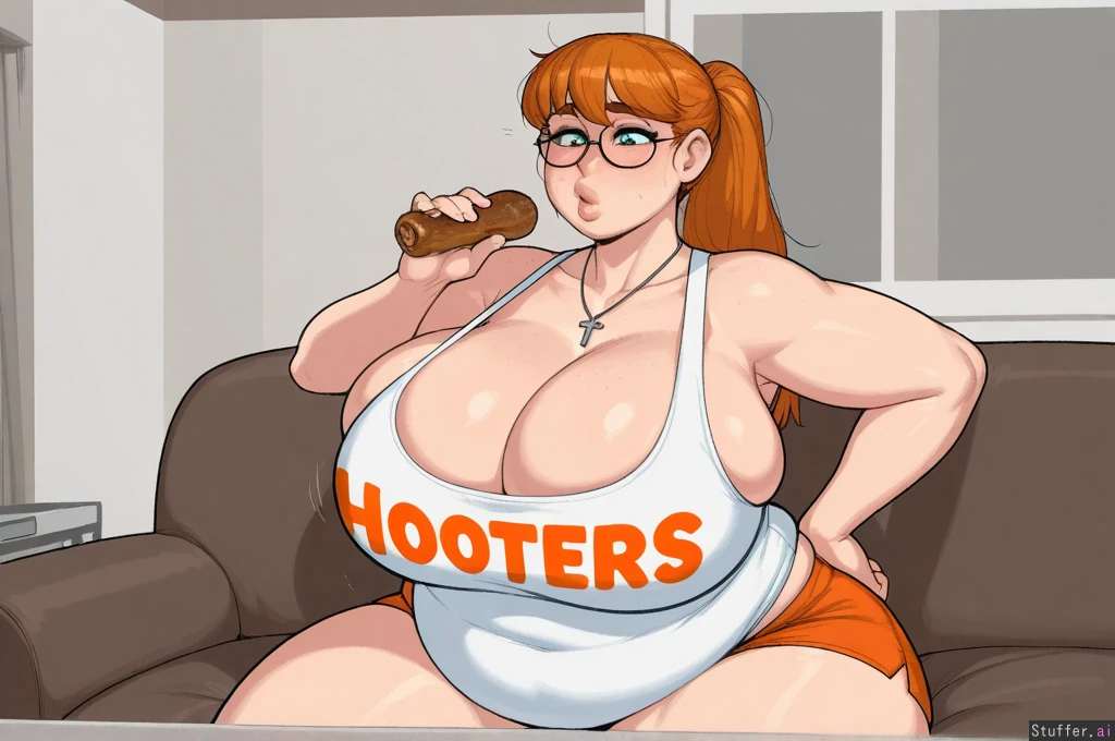 (( solo, krekkov, adult)) (( female, green_eyes, thick_lips, ((detailed_eyes)) )), ginger hair, long ponytail, glasses ((Hooters, white_shirt, orange_shorts, cleavage, cross_necklace)) gigantic_belly, gigantic_breasts, gigantic_thighs, hyper_belly, hyper_breasts, hyper_thighs, mature, bloated_belly, immobile, morbidly_obese, indoors, messy_room, eating, takeout_containers, couch, casual, eating food, looking_down, heavy_blush, holding_food, motion_lines hand_on_hips)), shy, freckles