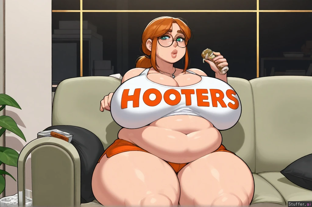 (( solo, krekkov, adult)) (( female, green_eyes, thick_lips, ((detailed_eyes)) )), ginger hair, long ponytail, glasses ((Hooters, white_shirt, orange_shorts, cross_necklace)) gigantic_belly, gigantic_breasts, gigantic_thighs, hyper_belly, hyper_breasts, hyper_thighs, mature, bloated_belly, immobile, morbidly_obese, indoors, messy_room, eating, takeout_containers, couch, casual, shy, freckles, huge_belly, belly_bigger_than_body:2.5