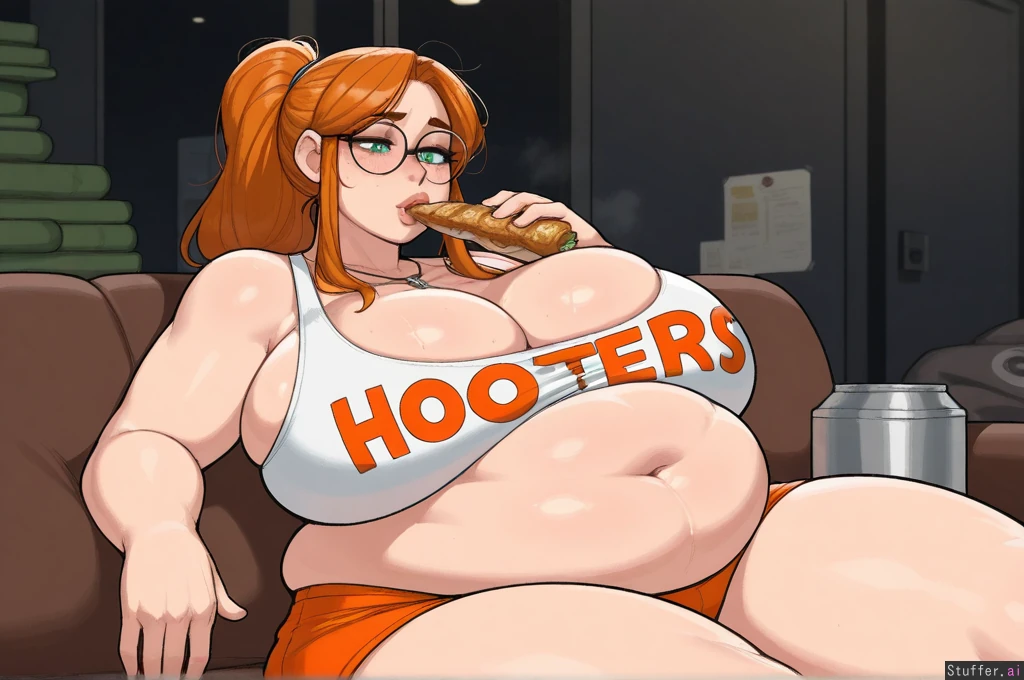 (( solo, krekkov, adult)) (( female, green_eyes, thick_lips, ((detailed_eyes)) )), ginger hair, long ponytail, glasses ((Hooters, white_shirt, orange_shorts, cross_necklace)) gigantic_belly, gigantic_breasts, gigantic_thighs, hyper_belly, hyper_breasts, hyper_thighs, mature, bloated_belly, immobile, morbidly_obese, indoors, messy_room, eating, takeout_containers, couch, casual, shy, freckles, huge_belly, belly_bigger_than_body:2.5