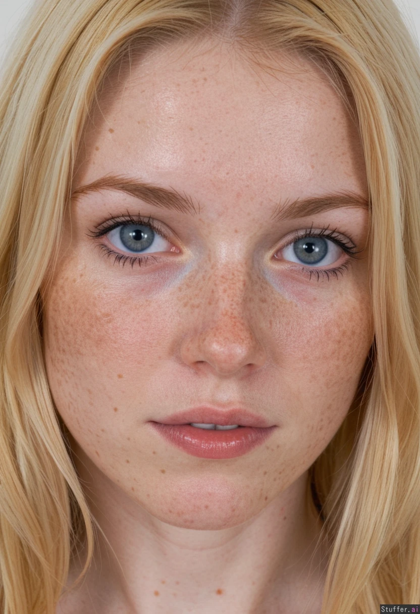 a girl with many freckles, blond hair, pale skin and blue eyes