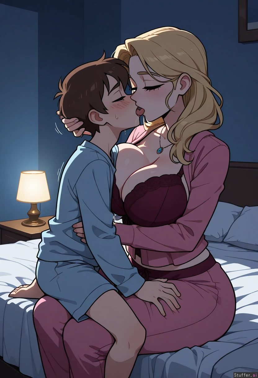 vanripper(artist), sensual_image, correct_anatomy, (a_male_and_a_woman), (((mature_female))), ((older_woman)), ((boy_and_mom))), ((big_sexy_lips)), necklace, lingerie, boy wearing pajamas, curvy_body, blonde_hair, (moaning), ((huge_breasts)), ((soft_saggy_breasts)), (deep_cleavage), (hard_nipple_outline), (voluptuous), ((wide_hips)), ((huge_ass)), in_bedroom, (((morning_lighting))), age_difference, male_kissing_female, making_out, drooling, tongues_out, ((male_sitting_in_her_lap)), sitting in bed, boy_hand_grabbing_her_breast, motion_lines, stature