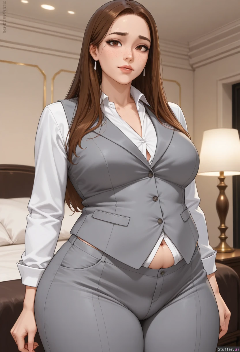 **base** (best quality), (high rating), absurd res, high res, detailed, ultra quality, ((high quality)), masterpiece, (ultra high resolution), stunning beauty, detailed face, intricate detail, sophisticated detail, exquisite detail, perfect 2D art, realistic lighting, realistic shading, correct anatomy, 8k, (highly detailed face), highly detailed skin texture, 1girl, ((hyperrealistic, photorealistic)), (((detailed face))), ((solo)), **artists** Kittew(artist), aromasensei(artist), miyu(artist), albatrossart(artist), balecxi(artist), modeus14(artist), **appearance** brunette, (((British woman, tall, adult, 25 years old, freckles))), (((intricately detailed sexy expressive eyes, brown eyes))), (((long straight hair, chestnut brown hair))), sexy face, thin face, (((freckles, thick_eyebrows, tall))), (((expressive_face, tall))), **clothes** (((Long sleeve White button up shirt, grey buttoned suit vest, grey business pants, classy))), **setting** at a beautiful hotel lounge, nighttime, Warm lighting, lamp lighting, low light, diffuse light, dim light, (detailed background, realistic background), **pose** (((expressive eyes))), (((raised eyebrows))), **body** (((Huge_thighs, big_fat_belly, huge_ass, massive_thighs, huge_hips, huge_fat_body:1.3)))