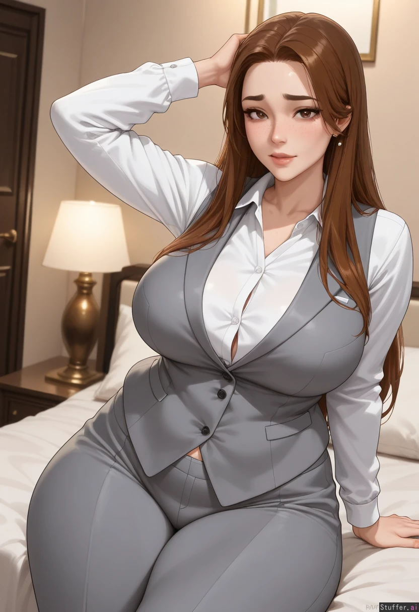 **base** (best quality), (high rating), absurd res, high res, detailed, ultra quality, ((high quality)), masterpiece, (ultra high resolution), stunning beauty, detailed face, intricate detail, sophisticated detail, exquisite detail, perfect 2D art, realistic lighting, realistic shading, correct anatomy, 8k, (highly detailed face), highly detailed skin texture, 1girl, ((hyperrealistic, photorealistic)), (((detailed face))), ((solo)), **artists** Kittew(artist), aromasensei(artist), miyu(artist), albatrossart(artist), balecxi(artist), modeus14(artist), **appearance** brunette, (((British woman, tall, adult, 25 years old, freckles))), (((intricately detailed sexy expressive eyes, brown eyes))), (((long straight hair, chestnut brown hair))), sexy face, thin face, (((freckles, thick_eyebrows, tall))), (((expressive_face, tall))), **clothes** (((Long sleeve White button up shirt, grey buttoned suit vest, grey business pants, classy))), **setting** at a beautiful hotel lounge, nighttime, Warm lighting, lamp lighting, low light, diffuse light, dim light, (detailed background, realistic background), **pose** (((expressive eyes))), (((raised eyebrows))), **body** (((Huge_thighs, big_fat_belly, huge_ass, massive_thighs, huge_hips, huge_fat_body:1.3)))