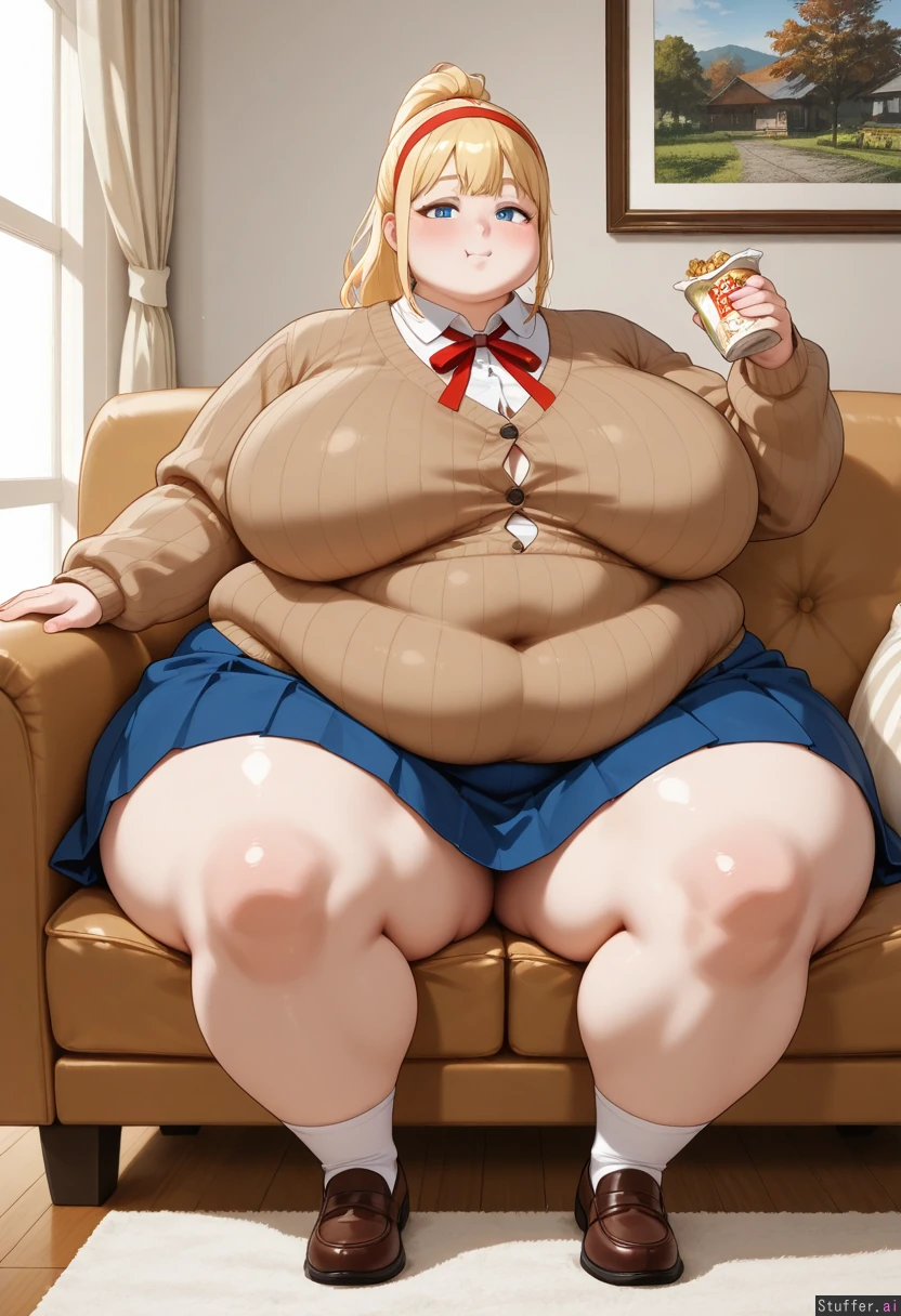 Realistic, dynamic shading, solo, 1girl, (Covered navel, ribbed green long sleeve button sweater, brown cardigan, white long sleeve shirt, blue skirt, red neck ribbon, red hairband, brown loafers), tight clothes, button gap, Long blonde ponytail, blonde bangs, blue eyes, pale skin, short, Living room, cushioned couch, sitting upright, binge eating burritos, (Morbidly Obese, weight gain, immobile, fatter, love handles), full body, ((Fat round face, chubby cheeks, double chin, fat arms)), Gigantic breasts, plump breasts, wide spread breasts, gigantic hips, wide hips, hips_wider_than_shoulders, gigantic ass, gigantic butt, gigantic thighs, thicc thighs, narrow shoulders, bloated
