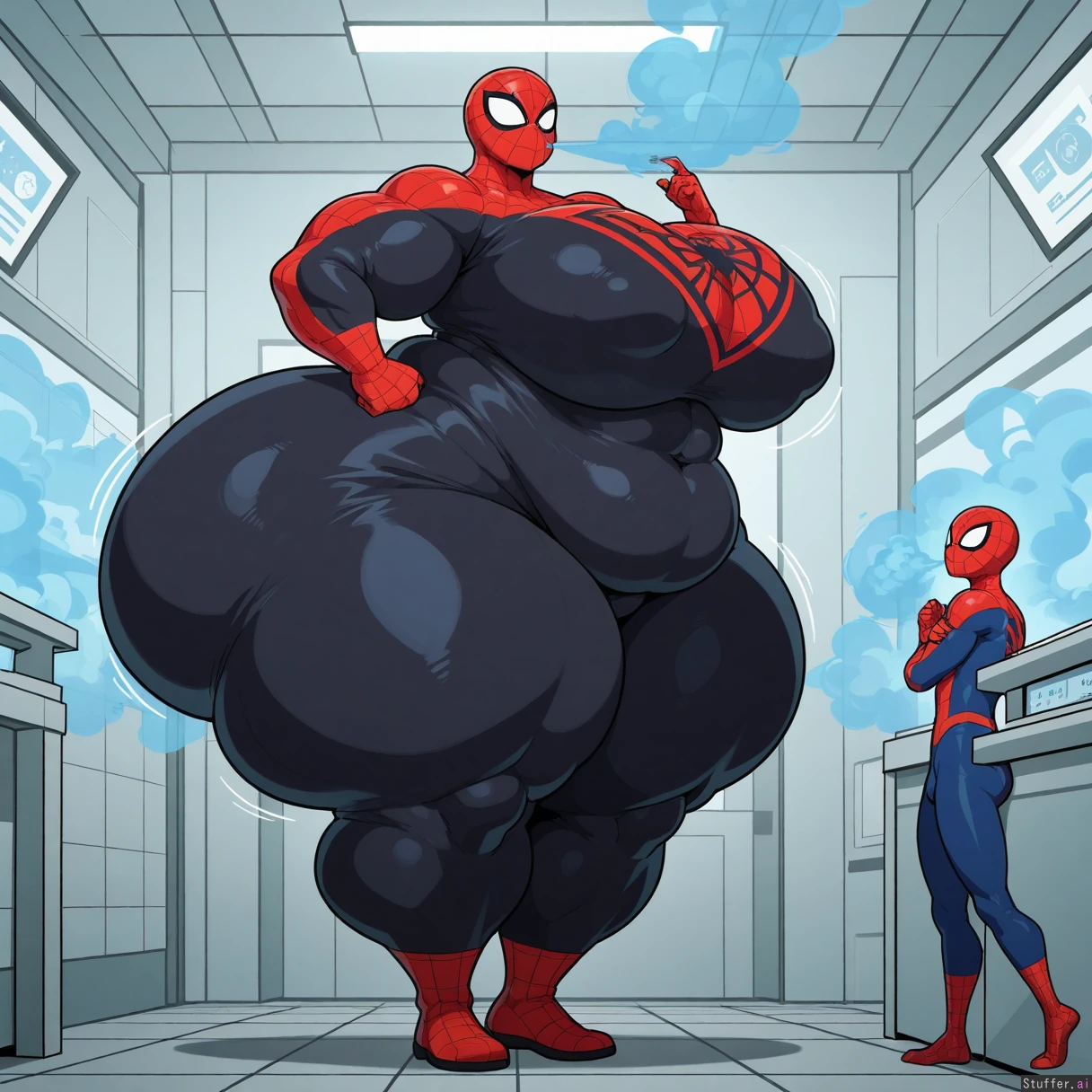 vanripper, jujunaught, flat colors, (Female spider-man, accurate red and blue spider-man suit, spider-man mask no mouth), tall female, large breasts, abs, thick thighs, thighs, (hyper latina:1.4), ((Hyper obese hips:1.3),(gigantic_fat_thighs)), (engorged breasts), (swollen breasts), ((enormous wide hips), (meaty thick thighs), (gigantic humongous fatass:1.6)), (huge body), (tall female), (long legs), detailed background, indoors, (in a lab test chamber, surrounded by blue fart gas, inflating rapidly from fart gas), side angle, panicking, nervous