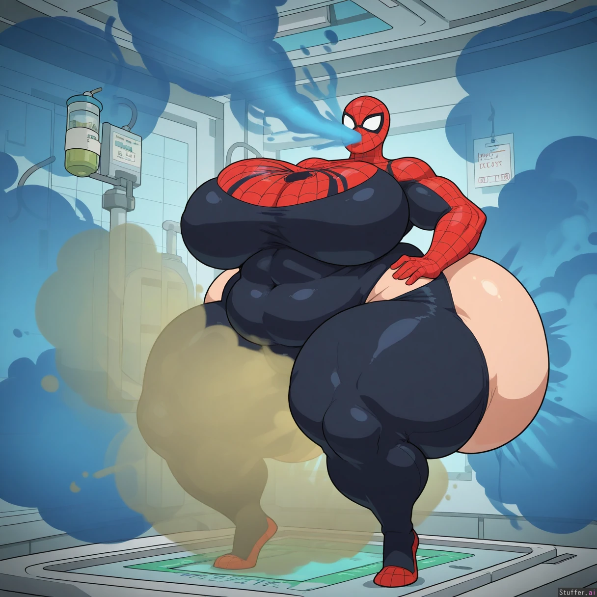 vanripper, jujunaught, flat colors, (Solo, Female spider-man, accurate red and blue spider-man suit, spider-man mask no mouth), tall female, large breasts, abs, thick thighs, thighs, ((hyper latina:1.4)), ((Hyper obese hips:1.3),(gigantic_fat_thighs)), (engorged breasts), (swollen breasts), ((enormous wide hips), (meaty thick thighs), (gigantic humongous fatass:1.6)), (huge body), (tall female), (long legs), detailed background, indoors, (in a lab test chamber, surrounded by blue fart gas, rapidly inflating from fart gas:1.5), side angle, panicking, nervous