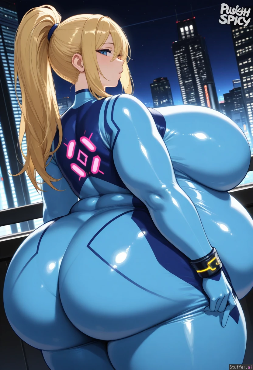 (masterpiece). (best quality). (ultra-detailed). (16k). (trending on Pixiv). (score_1). (score_9). (score_8). (score_7). (modern/contemporary art). (anime style). (manga style). (ecchi, ecchi style) (perfect 2D art). (modern 2D stylized look). (high rating). (HDR). (UHD). (smooth texture). (absurd res). (anime screen cap). (anime extract). (1080p). (intricate detail). (highly detailed). (sophisticated quality). (detailed lighting). (best lighting). (light diffusion). (best shading). (official art). (official style). (realistic line art). Lewdlemage(artist:1.5), betterwithsalt(artist:1.5), usa37107692(artist:1.5), Ourobot(artist:1.5), blushyspicy(artist:1.5), spellsX(artist:1.5), Hews(artist:1.5), krekkov(artist:1.5), KAMII MOMORU(artist:1.5). (1women). (Samus Aran) (round face). (blue eyes). (blonde hair, long hair, hair tied into a ponytail). (large breasts, large podgy breasts, large pudgy breasts, large voluptuous breasts, large chubby breasts, large fat breasts, large obese breasts, large morbidly obese breasts, large soft body, USSBBW, large podgy body, large pudgy body, large voluptuous body, large chubby body, large fat body, large obese body, large morbidly obese body, podgy arms, pudgy arms, voluptuous arms, chubby arms, fat arms, obese arms, morbidly obese arms, podgy back, pudgy back, voluptuous back, chubby back, fat back, obese back, morbidly obese back, large belly pooch, large fat rolls, large podgy waistline, large pudgy waistline, large voluptuous waistline, large chubby waistline, large fat waistline, large obese waistline, large morbidly obese waistline, large podgy belly, large pudgy belly, large voluptuous belly, large chubby belly, large fat belly, large obese belly, large morbidly obese belly:1.2). (Dutch angle). (Cowboy shot). (wearing a skin-tight zero suit). (nighttime). (futuristic city background). (standing). (dynamic pose).