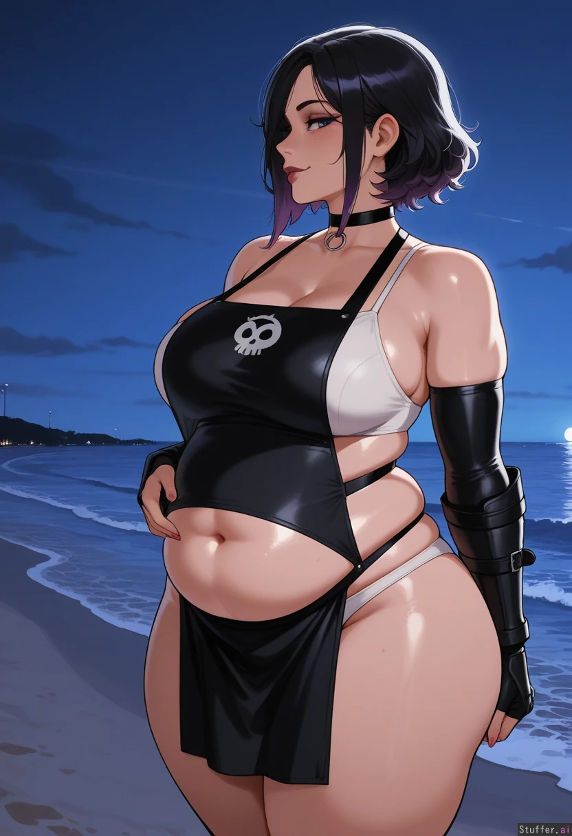 nyantcha:1.2), (krekkov:1.4), (reiq:1.1), (kittew:1.3), best quality, intricate details, hdr, detailed eyes, (soft shading), realistic, dim lighting, realistic lighting, 1 mature woman, looking at viewer, (front view), flirty, Black hair with purple highlights, blue eyes, Bright red lipstick, Smirk, Profile, (wide hips: 2.5), ((thick thighs:1.4)), large breasts, legs crossed, ((chubby_belly: 1.6)), weight_gain, Black apron, white bra, white panties, black arm sleeve gauntlets, choker, Beach at night, standing in sand,