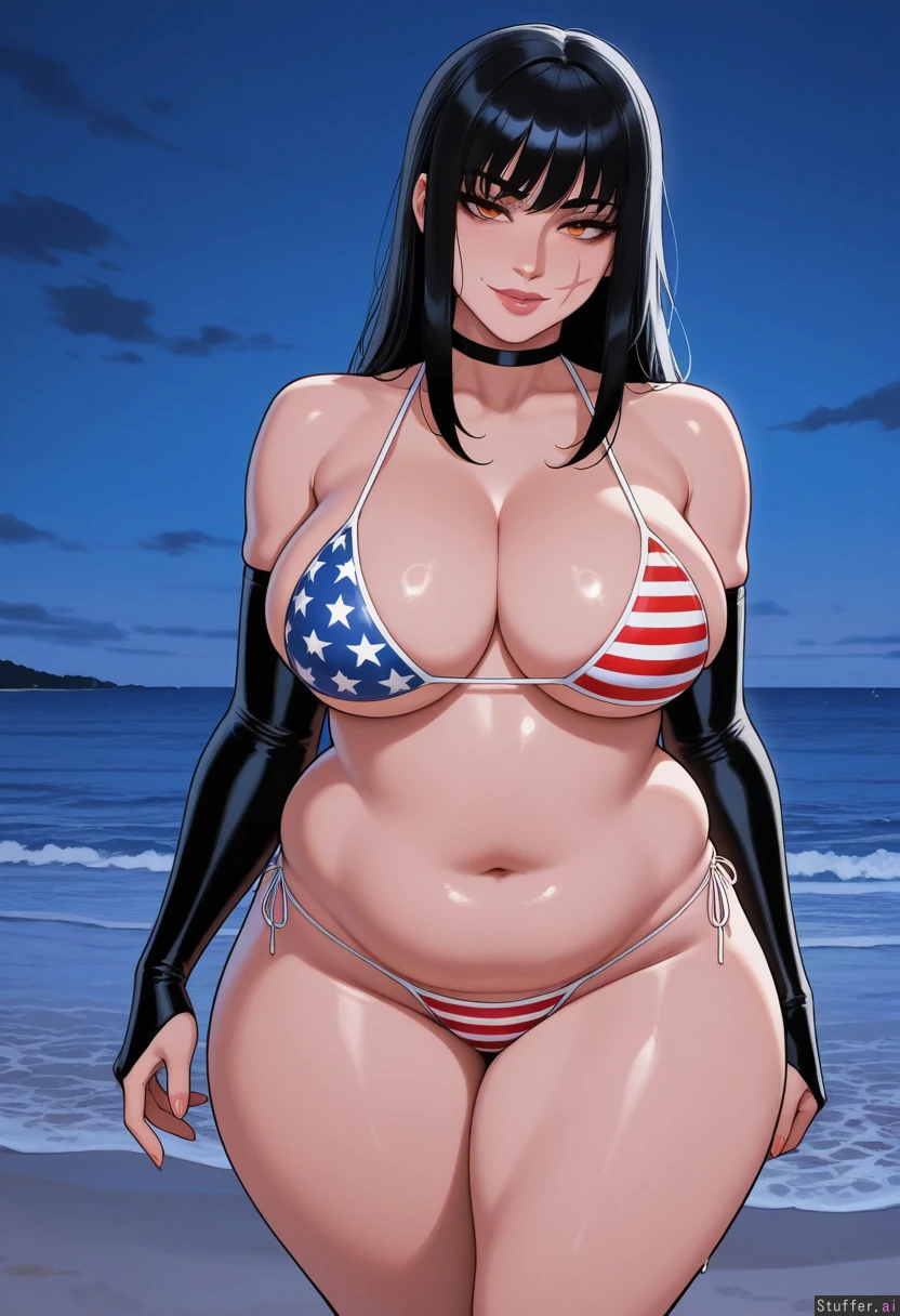nyantcha:1.2), (krekkov:1.4), (reiq:1.1), (kittew:1.3), best quality, intricate details, hdr, detailed eyes, (soft shading), realistic, dim lighting, realistic lighting, 1 mature woman, Yoru from Chainsaw Man, looking at viewer, (front view), flirty, Black hair, Orange eyes, Yoru's scar on right cheek, Smirk, (wide hips: 2.5), ((thick thighs:1.4)), large breasts, legs crossed, ((chubby_belly: 1.6)), weight_gain, American themed bikini (red, white, and blue), black arm sleeve gauntlets, choker, Beach at night, standing in sand,
