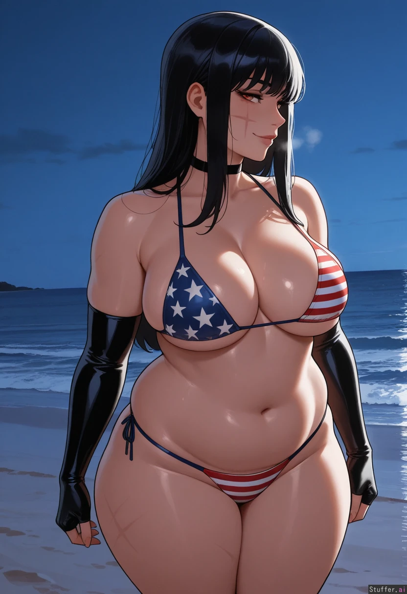 nyantcha:1.2), (krekkov:1.4), (reiq:1.1), (kittew:1.3), best quality, intricate details, hdr, detailed eyes, (soft shading), realistic, dim lighting, realistic lighting, 1 mature woman, Yoru from Chainsaw Man, looking at viewer, (front view), flirty, Black hair, Orange eyes, Yoru's scar on right cheek, Smirk, Profile, (wide hips: 2.5), ((thick thighs:1.4)), large breasts, legs crossed, ((chubby: 1.6)), weight_gain, American themed bikini (red, white, and blue), black arm sleeve gauntlets, choker, Beach at night, standing in sand,