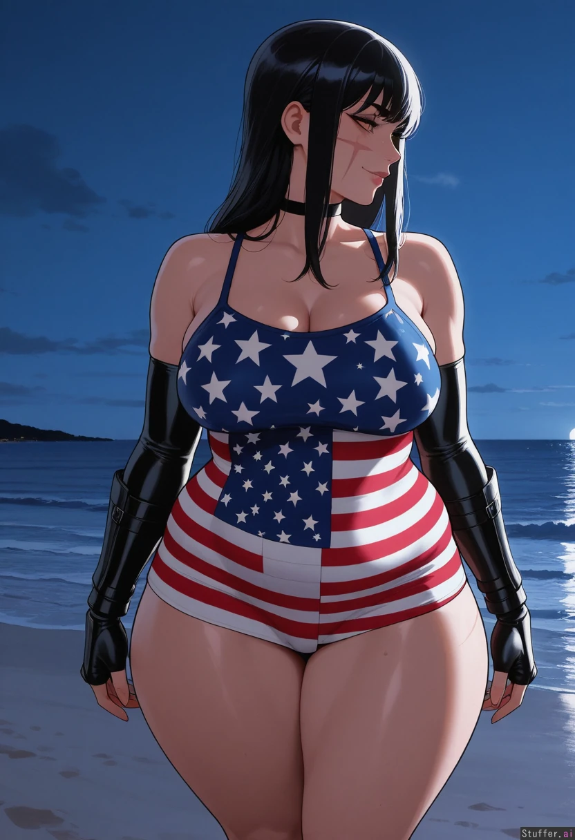 nyantcha:1.2), (krekkov:1.4), (reiq:1.1), (kittew:1.3), best quality, intricate details, hdr, detailed eyes, (soft shading), realistic, dim lighting, realistic lighting, 1 mature woman, Yoru from Chainsaw Man, looking at viewer, (front view), flirty, Black hair, Orange eyes, Yoru's scar on right cheek, Smirk, Profile, (wide hips: 2.5), ((thick thighs:1.4)), large breasts, legs crossed, ((chubby: 1.6)), weight_gain, American themed dress (red, white, and blue), black arm sleeve gauntlets, choker, Beach at night, standing in sand,