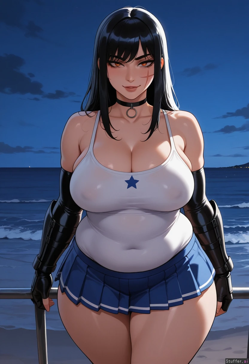 nyantcha:1.2), (krekkov:1.4), (reiq:1.1), (kittew:1.3), best quality, intricate details, hdr, detailed eyes, (soft shading), realistic, dim lighting, realistic lighting, 1 mature woman, Yoru from Chainsaw Man, looking at viewer, (front view), flirty, Black hair, Orange eyes, Yoru's scar on right cheek, Smirk, (wide hips: 2.5), ((thick thighs:1.4)), large breasts, legs crossed, ((chubby: 1.6)), weight_gain, American themed pleated short skirt ( blue stars), no bra, white tank top, black arm sleeve gauntlets, choker, Beach at night, standing in sand,
