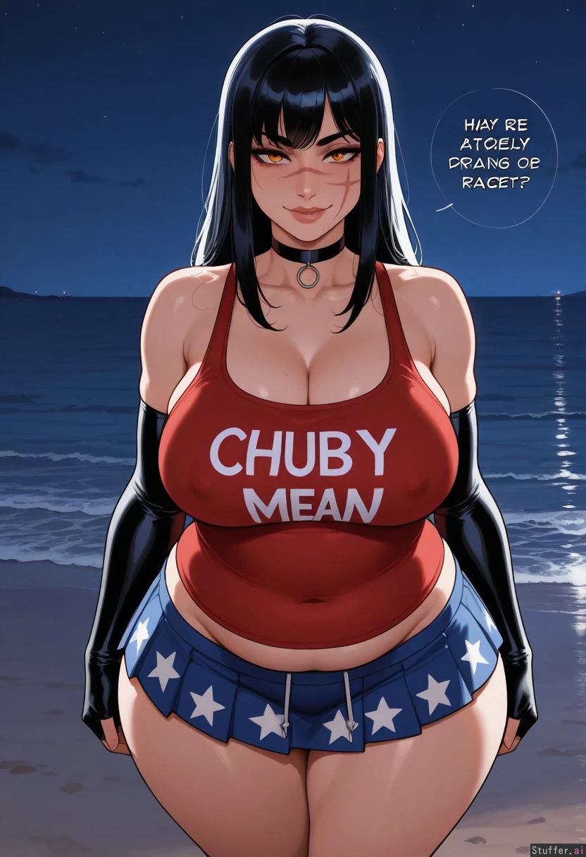 nyantcha:1.2), (krekkov:1.4), (reiq:1.1), (kittew:1.3), best quality, intricate details, hdr, detailed eyes, (soft shading), realistic, dim lighting, realistic lighting, 1 mature woman, Yoru from Chainsaw Man, looking at viewer, (front view), flirty, Black hair, Orange eyes, Yoru's scar on right cheek, Smirk, (wide hips: 2.5), ((thick thighs:1.4)), large breasts, legs crossed, ((chubby: 1.6)), weight_gain, Blue American star-themed pleated short skirt, no bra, red tank top, black arm sleeve gauntlets, choker, Beach at night, standing in sand,