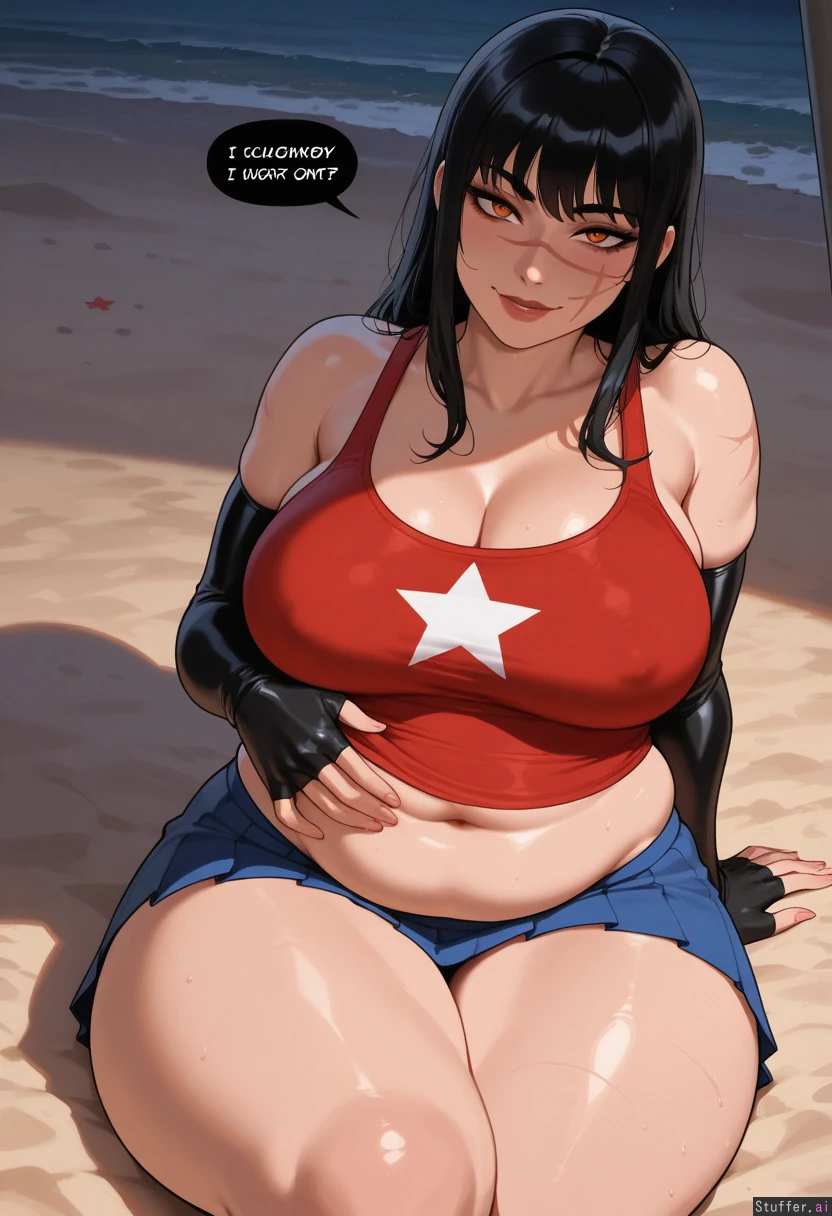nyantcha:1.2), (krekkov:1.4), (reiq:1.1), (kittew:1.3), best quality, intricate details, hdr, detailed eyes, (soft shading), realistic, dim lighting, realistic lighting, 1 mature woman, Yoru from Chainsaw Man, looking at viewer, (front view), flirty, Black hair, Orange eyes, Yoru's scar on right cheek, Smirk, (wide hips: 2.5), ((thick thighs:1.4)), large breasts, legs crossed, ((chubby: 1.6)), weight_gain, Teasing (squeezing belly), Blue American star-themed pleated short skirt, no bra, red tank top, black arm sleeve gauntlets, Beach at night, sitting in sand,