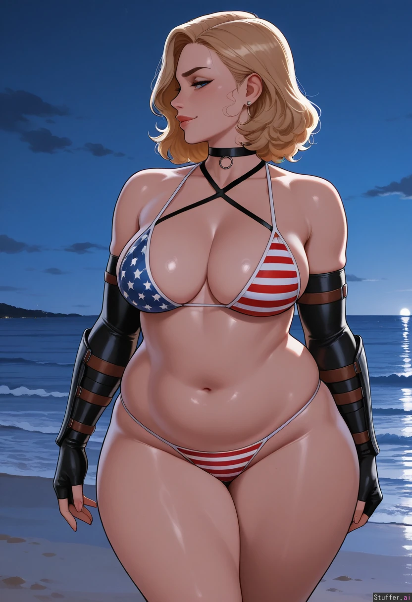 nyantcha:1.2), (krekkov:1.4), (reiq:1.1), (kittew:1.3), best quality, intricate details, hdr, detailed eyes, (soft shading), realistic, dim lighting, realistic lighting, 1 mature woman, Natasha Romanov, looking at viewer, (front view), flirty, Blonde hair, Blue eyes, Pronounced cheekbones, Smirk, Profile, (wide hips: 2.5), ((thick thighs:1.4)), engorged medium breasts, legs crossed, ((chubby: 1.6)), weight_gain, girthy bulked stocky sexy chunky fertile Body, thick arms, fat beefy arms , large hips, wide shoulders, thick shoulders, American themed bikini (red, white, and blue), black arm sleeve gauntlets, choker, Beach at night, standing in sand,