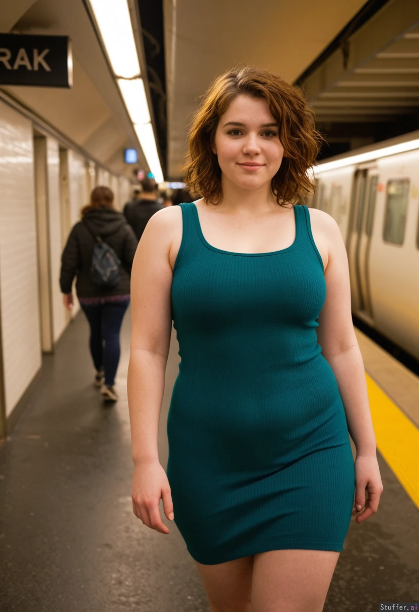 Street photography style, medium shot of a 20-year-old woman with messy mahogany hair, standing in a crowded urban subway station. She has a stocky, curvy, and fuller figure with a noticeably rounded stomach and thick, plush thighs. She is wearing a tight, form-fitting emerald green ribbed knit dress that clings to her soft curves and emphasizes her weight and presence. Her skin is smooth and luminous. Her posture is confident and grounded, taking up space with ease. Her expression is calm and empowered with a faint, knowing smile. Cool-toned morning light, high contrast, 8k resolution, photorealistic, capturing a sense of radical self-acceptance and physical volume in a public space. midriff_peak