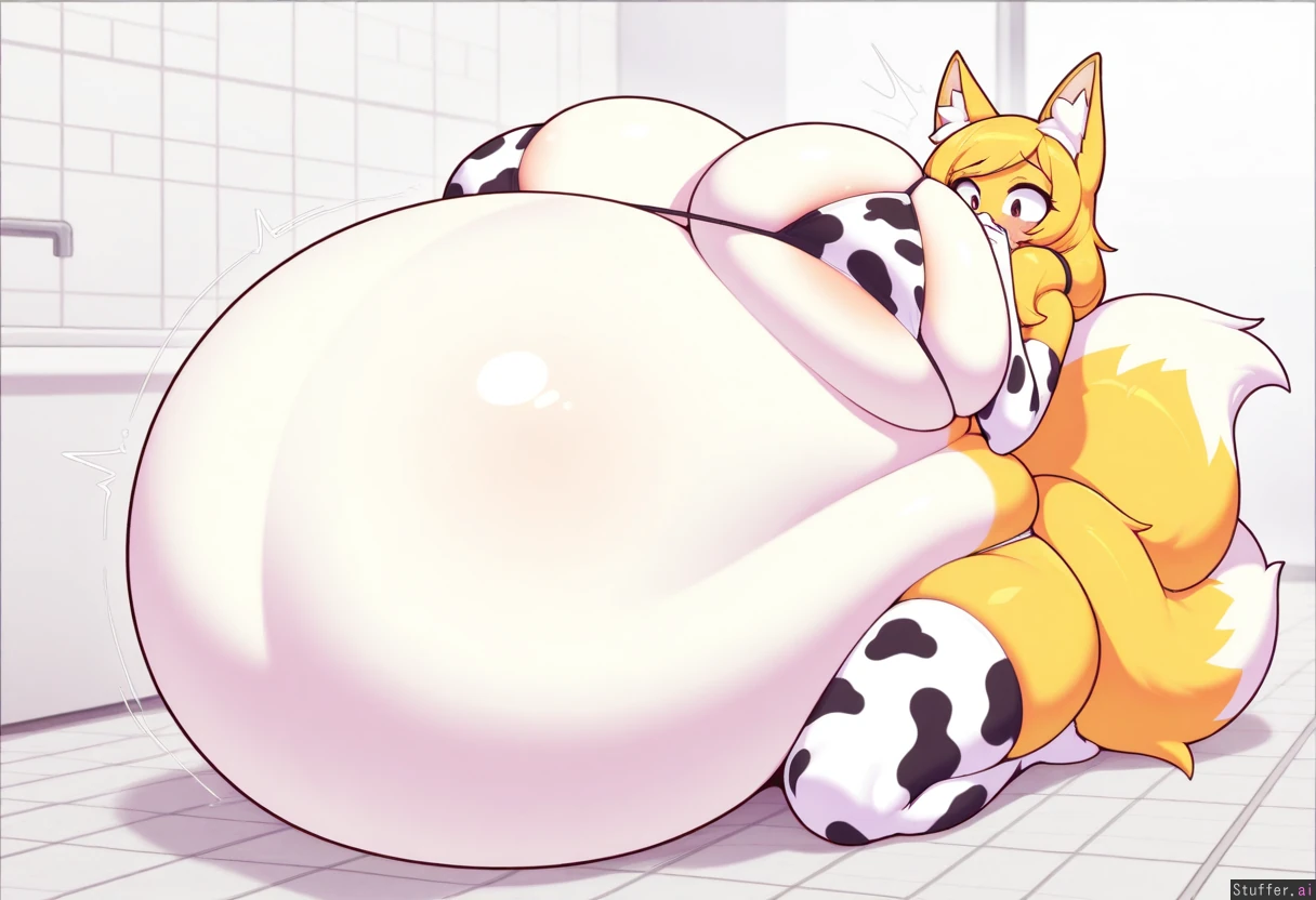 Fizintine(artist), best quality, skindentation, thick lines, white outline, 1girl, ((Anthro fox, yellow fur, obese)), (female tails the fox from sonic), cow print spiked thigh highs white gloves,(alone), solo anthro girl, furry, fox with two tails, tails_(sonic), fox_nose, front_view, short woman, pool, inside bathtub, outdoors, long hair, flaky hair, yellow pigtails hair, white belly fur, areolae, cow print bikini, paws, white pupils, in pool, standing, shy, worried, looking down at belly, hair_over_one_eye, hair_over_shoulder, wet_body, wet_hair, laying on , holding belly, white chest fur, cute fang, black tongue, ((blushing, surprised by someone walking in behind her, wincing eyes,)) vore belly, looking up wide, wide eyes, scared, shocked, covering mouth, spiting, stomach noises, digestion sounds, drooling, kneeling on floor, deep cleavage, breast on top of belly, (soft belly, soft skin:1.2), hand on belly, hiccupping, cow_print_bra, stretched clothing, gigantic ass, thin arms, thin thighs, ((gigantic belly:1.9)), (((round belly))), belly on floor, belly_between_legs, skindentation ((gigantic white furry breast, fat belly, gigantic ass:1.3)), ass_visible_from_front, laying down
