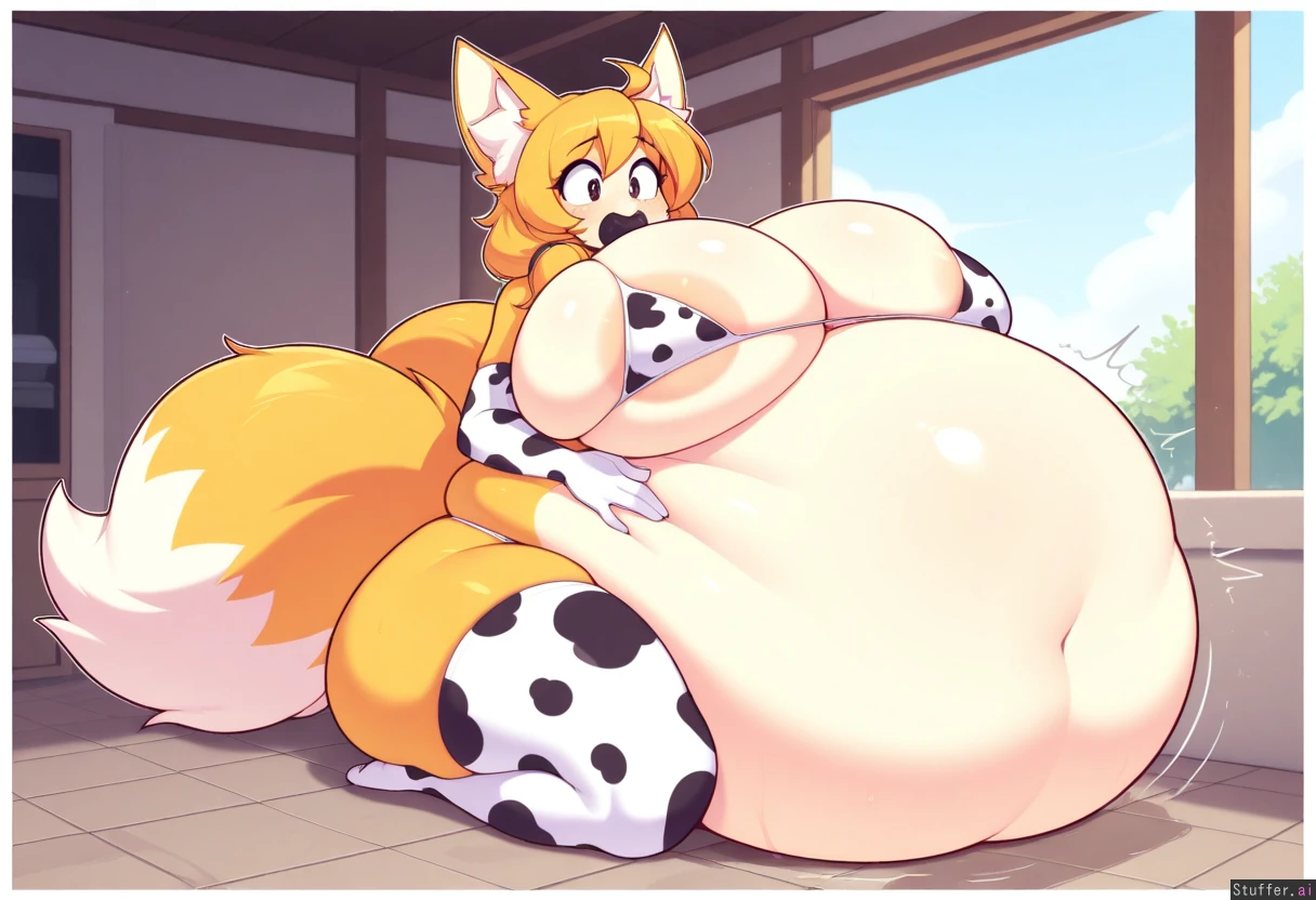 Fizintine(artist), best quality, skindentation, thick lines, white outline, 1girl, ((Anthro fox, yellow fur, obese)), (female tails the fox from sonic), cow print spiked thigh highs white gloves,(alone), solo anthro girl, furry, fox with two tails, tails_(sonic), (long_fox_snout), front_view, short woman, pool, inside bathtub, outdoors, long messy hair, flaky hair, yellow pigtails hair, white belly fur, areolae, cow print bikini, paws, white pupils, in pool, standing, shy, worried, looking down at belly, hair_over_one_eye, hair_over_shoulder, wet_body, wet_hair, laying on , holding belly, white chest fur, cute fang, black ball gag in mouth, ((blushing, surprised by someone walking in behind her, wincing eyes,)) vore belly, looking up wide, wide eyes, scared, shocked, burping, spiting, stomach noises, digestion sounds, drooling, sitting on floor, deep cleavage, breast on top of belly, (soft belly, soft skin:1.2), hand on belly, hiccupping, cow_print_bra, stretched clothing, gigantic ass, thin arms, thin thighs, ((gigantic belly:1.9)), (((round belly))), belly on floor, belly_between_legs, skindentation ((gigantic white furry breast, fat belly, gigantic ass:1.3)), ass_visible_from_front, laying down