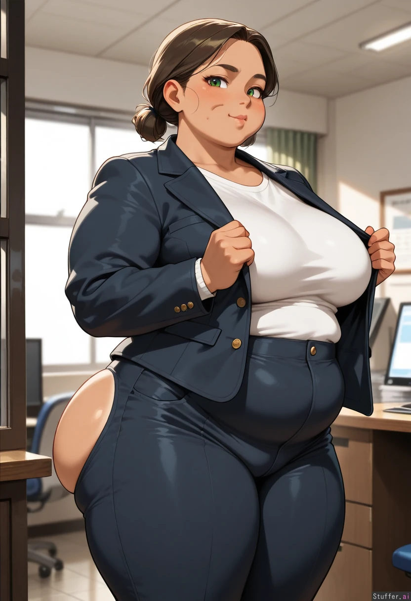 (masterpiece:1.2), (best quality:1.2), (highres:1.1), vibrant colors, crisp lines, (osiimiiartist(artist):0.6), (front view:1.1), (standing:1.2), 1girl, solo, milf, (overweight:0.7), (obese: 0.3), (fat arms:0.4), (double chin:0.4), (Engorged breasts:0.4), (medium breasts:0.6), (heavy breasts:0.6), (round breasts:0.6), (pendulous breasts:0.6), (large belly:0.6), (soft belly:0.6), (protruding stomach:0.4), (potbelly:0.4), (chubby waist), (wide hips:0.6), (broad hips:0.6), (flaring hips:0.4), (thick thighs:1.1), (thunder thighs:1.1), (thighs touching:0.6), (large buttocks: 1.0), (round buttocks: 1.1), (Thick arms), (beefy arms), (wide shoulders), wearing black pants, white shirt, black official jacket, (loose fit:0.8), office, (green eyes, cute chubby face, chubby cheeks, prominent cheekbones:1.4), brown long hair, tidy hairstyle, bangs, tanned skin, cinematic lighting, detailed background.