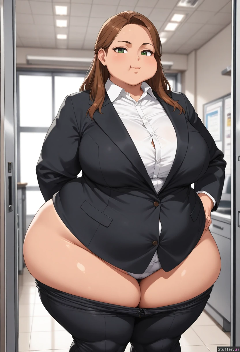 (masterpiece:1.2), (best quality:1.2), (highres:1.1), vibrant colors, crisp lines, (osiimiiartist(artist):0.6), (front view:1.1), (standing:1.2), 1girl, solo, milf, (overweight:0.7), (obese: 0.3), (fat arms:0.4), (double chin:0.4), (Engorged breasts:0.4), (medium breasts:0.6), (heavy breasts:0.6), (round breasts:0.6), (pendulous breasts:0.6), (large belly:0.6), (soft belly:0.6), (protruding stomach:0.4), (potbelly:0.4), (chubby waist), (wide hips:0.6), (broad hips:0.6), (flaring hips:0.4), (thick thighs:1.1), (thunder thighs:1.1), (thighs touching:0.6), (large buttocks: 1.0), (round buttocks: 1.1), (Thick arms), (beefy arms), (wide shoulders), wearing black pants, white shirt, black official jacket, fully clothed, snug clothes, (loose fit:0.8), office, (green eyes, cute chubby face, chubby cheeks, prominent cheekbones:1.4), brown long hair, tidy hairstyle, bangs, tanned skin, cinematic lighting, detailed background.