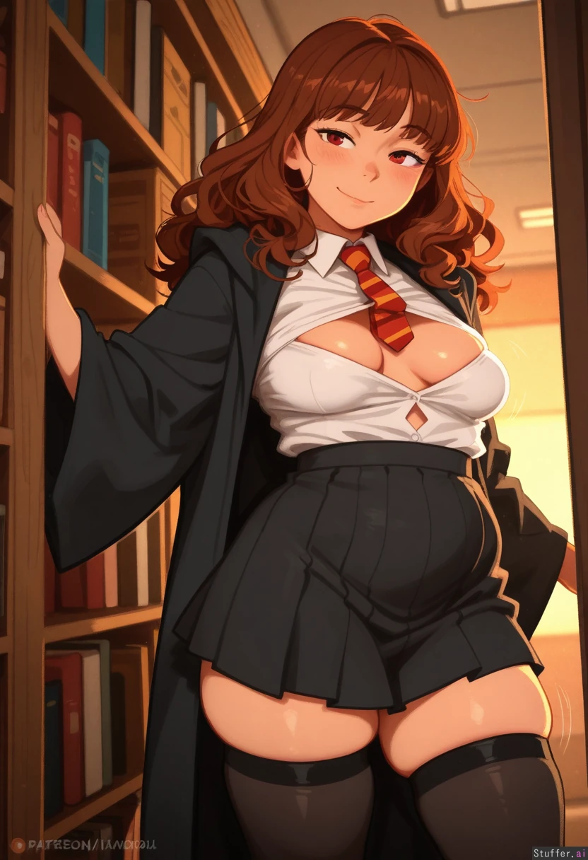 highly detailed, best quality, perfect anatomy, perfect proportions, perfect lighting, warm lighting, perfect shading, beautiful face, beautiful eyes, Krekkov /(artist/), KAMII MOMORU /(artist/), (khyle /(artist/)), textless, Hermione_Granger, brown hair, long curly hair, (skindentation:1.5), motion lines, Clothed, clothed chest, Hogwarts_uniform, white blouse, short black skirt, black thigh highs, black robes, striped necktie, in library, (dim_lighting), lifting edge of skirt, (seductive expression) (sagging_chest:1.5), nipple outline, 1flatchest, slightly_plump, fat thighs, plump ass, fat hips, chubby arms,