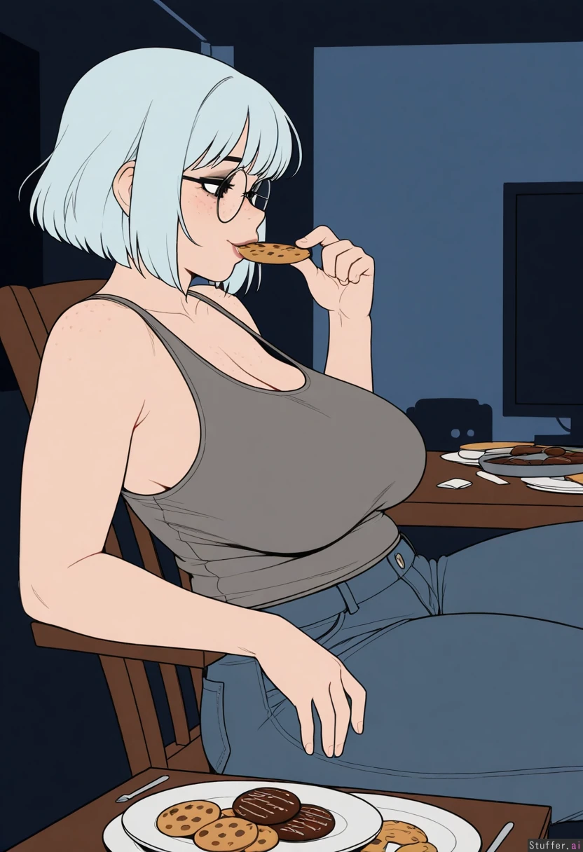 ((artist)), ((simple style)), (less detail), ((flat colors)), color, tall woman, 1girl, (dark room), (sagging breasts), (large breasts:1.1), (Sitting on wooden chair), (plates of chocolate donuts and cookies on table:1.25), leaning back, (next to table), (side view), looking down, ((Holding cookie in mouth, eating)), (Grey tanktop), (low rise jeans), ((Light_blue hair), wavy bob, medium hair, bangs), round glasses, face, (face freckles), (body freckles), cute round black eyes, nice eyelashes, eyeshadow, (double chin), thin, (thick thighs:1.2), Soft cheeks, round face, low brow, bored, ((tired)), (luscious big lips), (smile)