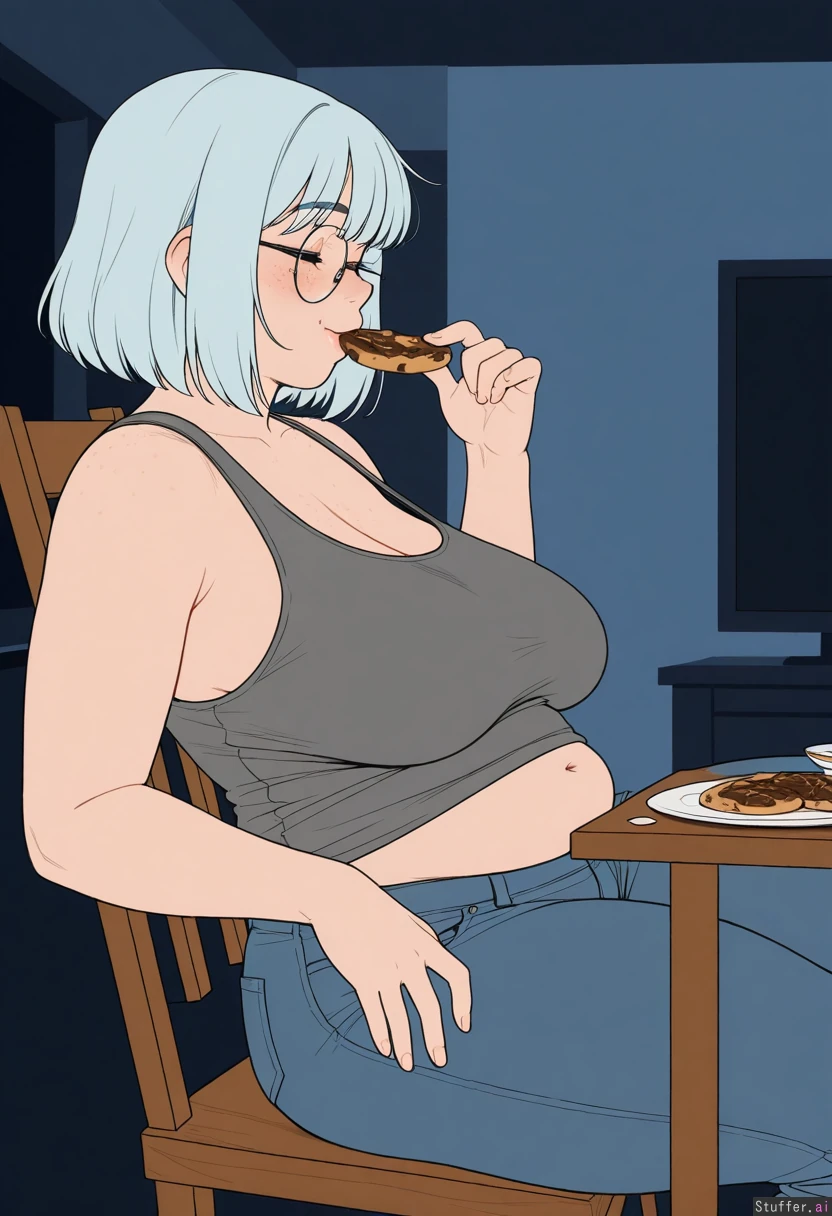 ((artist)), ((simple style)), (less detail), ((flat colors)), color, tall woman, 1girl, (dark room), (sagging breasts), (large breasts:1.1), (Sitting on wooden chair), (plates of chocolate donuts and cookies on table:1.25), leaning back, (next to table), (side view), looking down, ((Holding cookie in mouth, ((eating)))), (Grey tanktop), (low rise jeans), ((Light_blue hair), wavy bob, medium hair, bangs), round glasses, face, (face freckles), (body freckles), cute round black eyes, ((eyes closed)), nice eyelashes, eyeshadow, (double chin), (thick thighs:1.2), belly, Chubby cheeks, blushing, round face, low brow, bored, ((tired)), (luscious big lips), (smile)